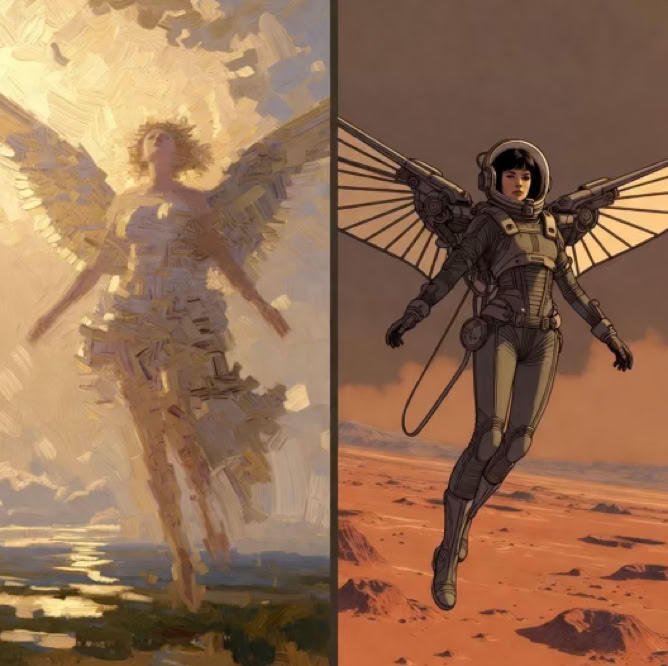 An ordinary set of wings is usually handmade of permaplastic. Wingsmiths require long training, as each set of wings must be tailored precisely to the musculature and bone structure of its owner. The wings of Narcissus and Cleopatra are far from ordinary. Fashioned of a titanium alloy, each feather tapering to rigid foil and anodized in barbaric colors, the "bones" fluted and internally stressed, with tendons of invisible unimolecular fiber, and pivots sheathed in precious stone, these wings are masterpieces of the wingsmith's art.” — A Double Shadow