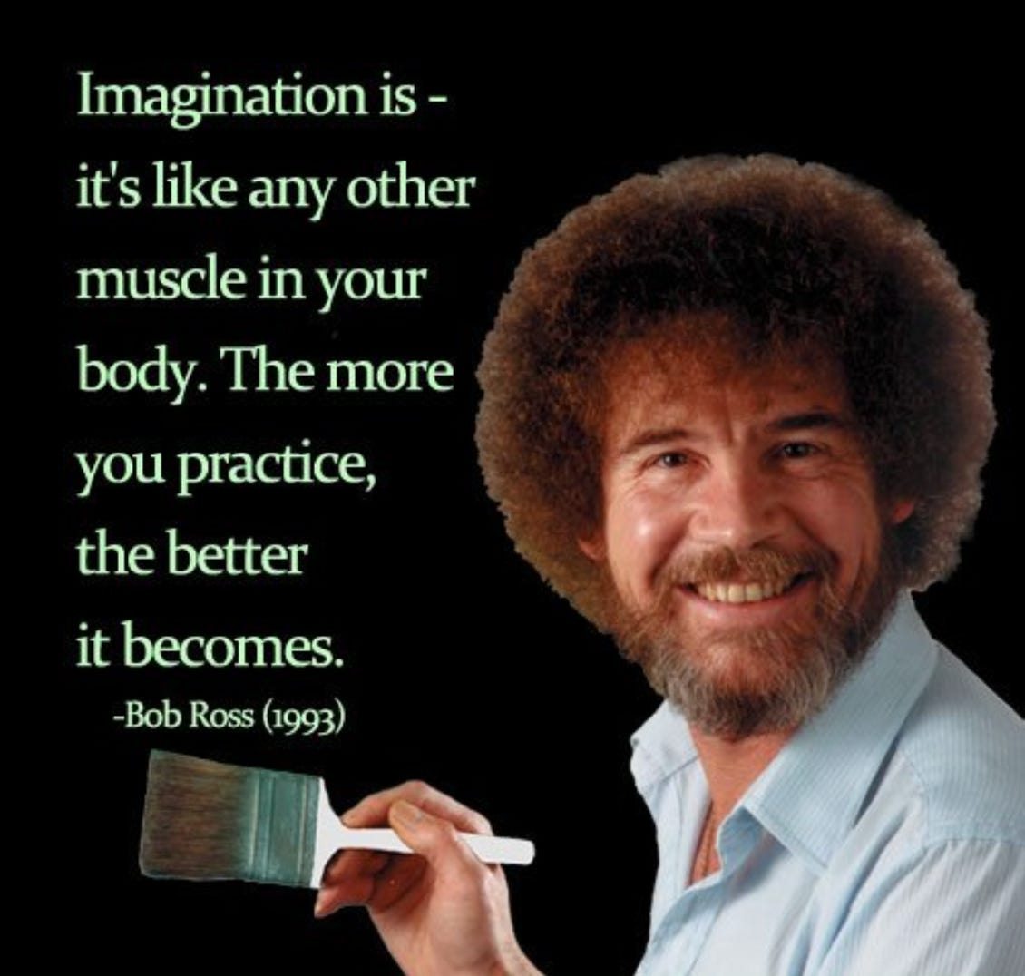 And I said there wouldn’t be too much text but heres just a little: and so we all know Bob Ross was ahead of his time but here is a reminder. (Read quote) — So I definitely agree with this and can specify one definition of imagination further and call it internal creative visualization, which likewise may be something that one can practice and improve upon just like the practice of painting.