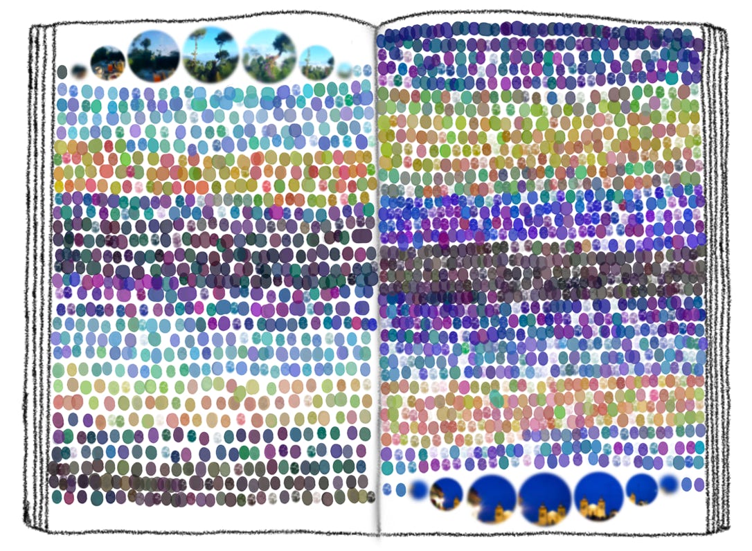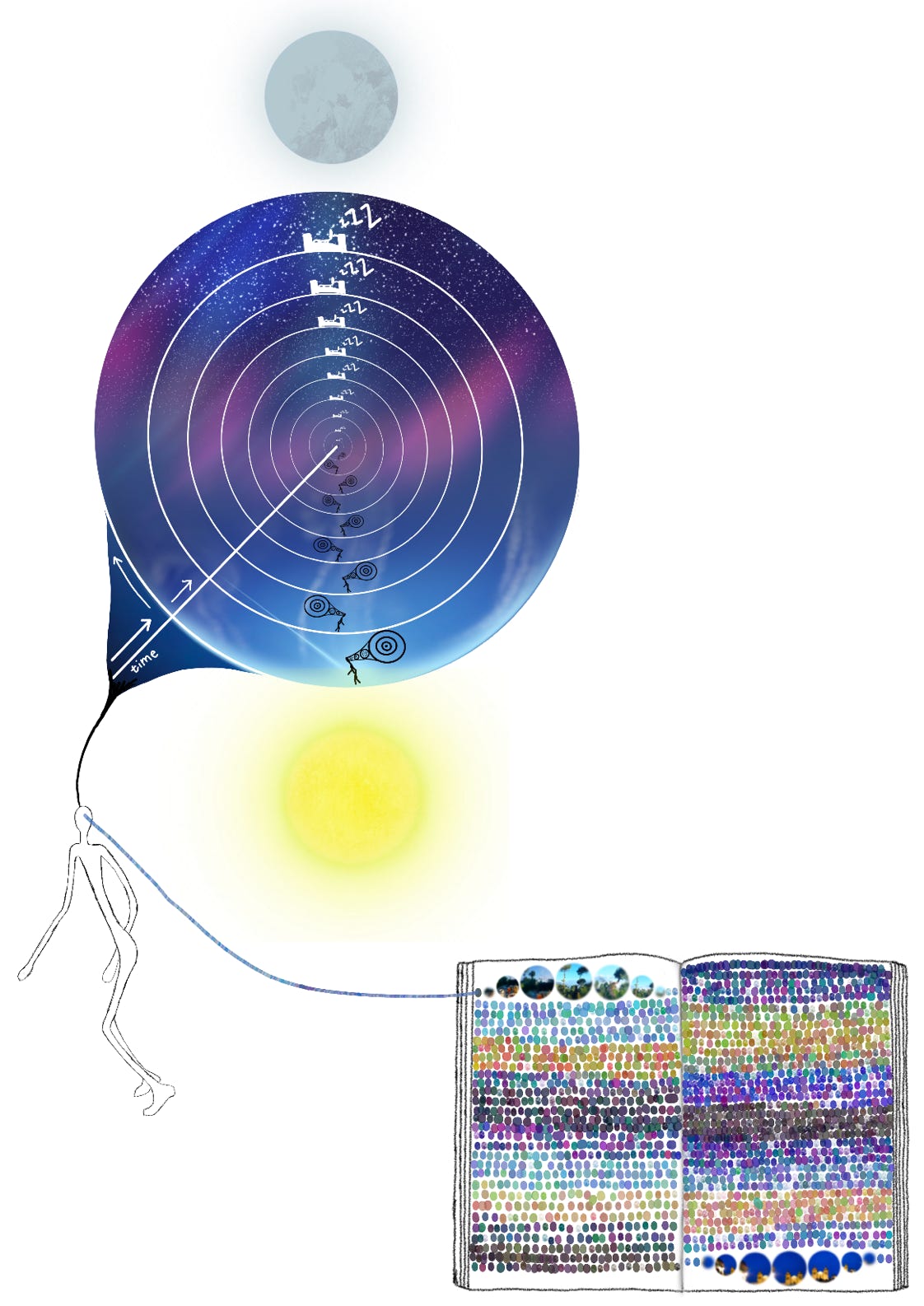 This is meant to serve as a brief snippet of a chapter from a book I wrote. For these slides I tried to minimize the amount of text since the talk is about the practice of seeing things, as well as seeing things differently, as well as how this process is connected to direct experience. For example, here is an abstract attempt at depicting two dimensions of time moving inwards and around, corresponding to the day & night oscillations that we live through. And then we can, again very abstractly, take the mind’s camera-recordings and turn it to a scrapbook of the visual components of our direct experiences.